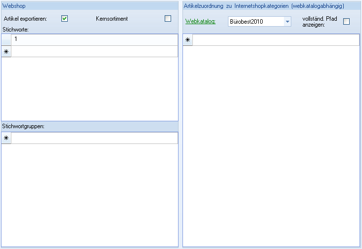 Webkatalog | Auswahl | Name des Webkataloges und Linklabel zur Maske Artikelkategorien |