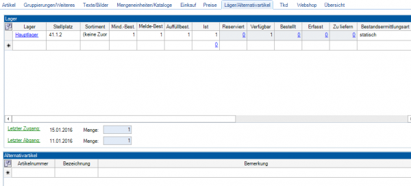 Registerkarte Läger/Alternativartikel