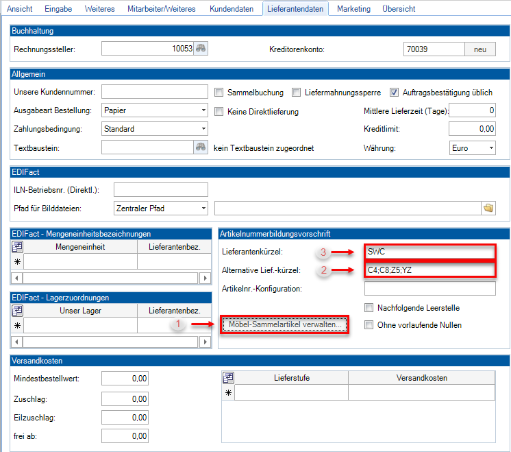 1. Auf der Registerkarte Lieferantendaten befindet sich die Schaltfläche Möbel-Sammelartikel verwalten. Concept Office legt den Sammelartikel immer für das eingetragene Lieferantenkürzel an.