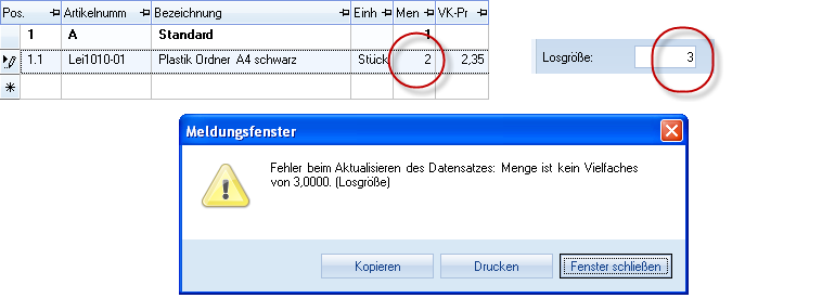 Concept Office weist den Sachbearbeiter auf Fehleingaben in der Positionserfassung hin, wenn eine Menge ungleich einem Vielfachen der Losgröße eingegeben wird.