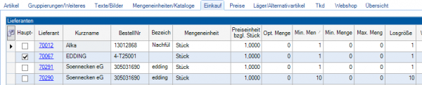 Die Losgröße im Einkauf ist der Faktor (bezogen auf die Mengeneinheit des Lieferanten) zu dem Sie den Artikel bei dem jeweiligen Lieferanten einkaufen können. Sie wird auf der Registerkarte EK für den verschiedenen Lieferanten hinterlegt.