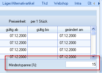 Am Artikel erfolgt die Eingabe auf der Registerkarte Preise im Feld Mindestspanne. Die Eingabe erfolgt in %.