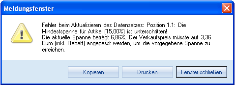 Wird dieser Artikel in einem Vorgang oder Angebot erfasst, und der Verkaufspreis unterschreitet die Spanne erscheint eine Meldung folgenden Typs.