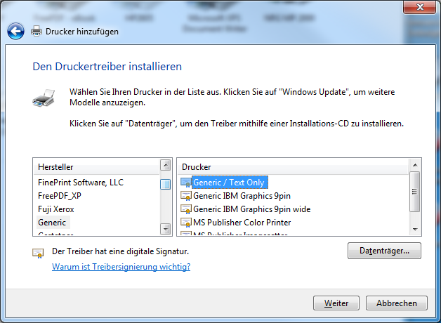 - Als Drucker „Generic / Text only“ auswählen