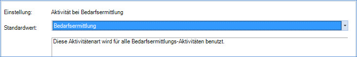 Da eine Bedarfsermittlung als Aktivität in Concept Office abgespeichert wird, wird eine Aktivitenart benötigt. Dafür ist unter Administration im Modul Standardwerte eine bestehende oder eine vorher neu angelegte Aktivitätenart zu hinterlegen.
