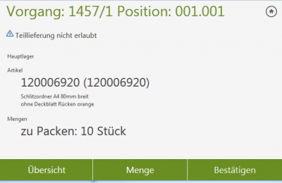 Über Bestätigen wird die Positionsmenge verbucht und anschließend kann die nächste Position verarbeitet werden.