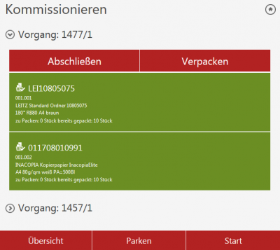 Über die Schaltfläche „Start“ wird der Kommissionier-Vorgang begonnen. Über „Übersicht“ kann in die Packzettelübersicht gewechselt werden, wobei der begonnene Vorgang unter „Aktuell“ angezeigt wird. Soll ein weiterer Vorgang mit bearbeitet werden, so kann aus der Tour der nächste Packzettel ausgewählt werden. Der Hinweistext des Lagerartikels wird angezeigt. Die Schaltfläche „Parken“ dient dazu, um bereits begonnene Vorgänge im jeweiligen Status zu belassen und zu einem späteren Zeitpunkt diese dann fertig zu stellen.