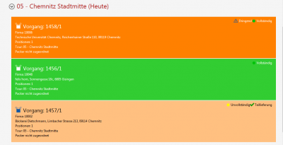 Zu jedem Auftrag werden die Lieferanschrift, die Anzahl der Positionen und die Versandart angezeigt. Weiterhin werden noch folgende Informationen angezeigt: