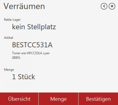 Über „Menge“ kann die Menge nochmals geändert werden. Über „Bestätigen“ wird anschließend der Artikel an das Lager gebucht. Wird keine Mengenänderung vorgenommen, so kann über Bestätigen solange gebucht werden, bis alle Artikel aus dem Umbuchungslager, in das Lager gebucht wurden. Auch beim Verräumen kann die jeweils zuletzt verräumte Position storniert werden. Im Modul Verräumen besteht die Möglichkeit den aktuellen Bestand zu bestätigen (z.B. für laufende Inventur).