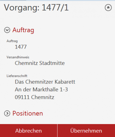 Zum Vorgang werden die Auftragsnummer, der Versandhinweis und die Lieferanschrift angezeigt. Unter Positionen werden die zu packenden Artikel mit der Artikelnummer, der Artikelbezeichnung, sowie der zu packende Menge angezeigt.