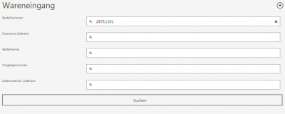 Sobald eine Bestellung beim Lieferanten ausgelöst wurde, steht diese für den Wareneingang in CO-Logistik zur Verfügung. Mittels Suchkriterien lässt sich genau die Bestellung filtern, die gerade eingetroffen ist. Erfolgt keine Einschränkung, dann können über den Button „Suchen“ alle offenen Bestellungen angezeigt werden.