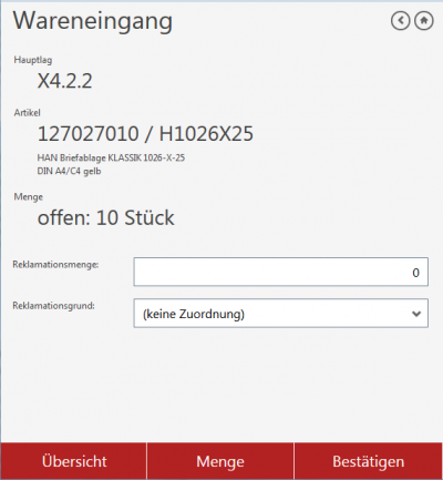 - Wird beim Wareneingang festgestellt, dass zur Position eine Reklamation vorliegt, so kann dies hier vorgenommen werden, indem der Reklamationsgrund vermerkt wird.