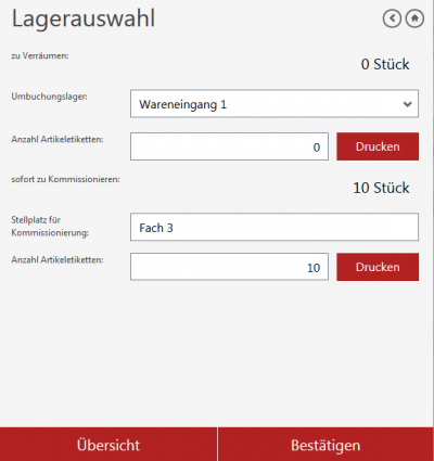 - Über den Button „Bestätigen“ gelangt man in das nächste Fenster, der Lagerauswahl. Hier erfolgt das eigentliche Zubuchen der Position.