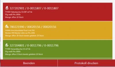 Anschließend können die Bestell-Positionen durch Klick auf eine Position bearbeitet werden. Hierbei muss nicht in einer bestimmten Reihenfolge abgearbeitet werden. Nicht bearbeitet Positionen werden rot dargestellt, bearbeitete Positionen werden grün dargestellt. In der nächsten Maske kann eine Mengenänderung vorgenommen werden. Außerdem besteht hier die Möglichkeit eine Reklamation zur Position zu vermerken.