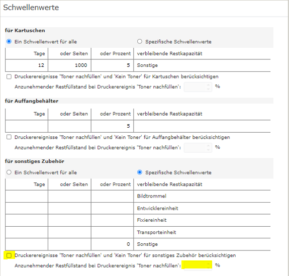 - der eingegebene Prozentsatz gilt für Toner, Auffangbehälter und Zubehör gleichermaßen