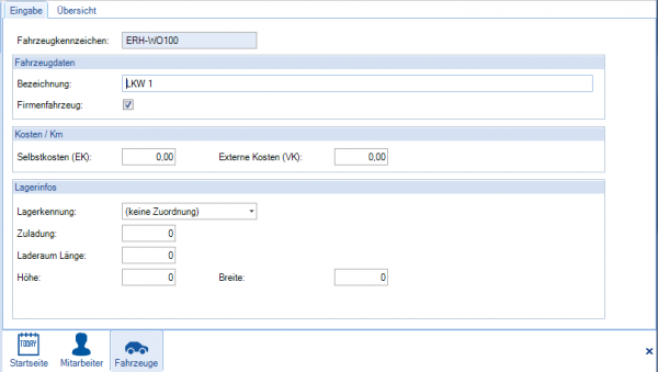 Alle genannten Ressourcen können als unabhängige Einheiten angelegt und verwaltet werden. Besteht die Situation, dass feste Verbindungen, z.B. zwischen LKW und dem Fahrer und/oder einem Monteur gäbe, kann dies entsprechend eingetragen werden. Über die Fahrzeugverwaltung wird ein LKW detaillierter definiert, wie z. B. durch sein amtl. Kennzeichen. Mit wenigen Handgriffen ist das Fahrzeug angelegt.
