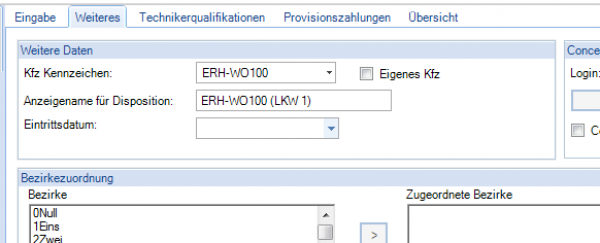 Nach der Anlage verknüpft man die Ressource, aus dem Mitarbeiterstamm, mit dem Fahrzeug, indem man unter dem Mitarbeiter-Tab Weiteres in der Rubrik Weitere Daten via Drop-Down-Menü des Feldes Kfz Kennzeichen das Fahrzeug auswählt und zuordnet. Gleiches ist bei den Personen durchzuführen, welche fix dem Fahrzeug zugeordnet sind. So entstehen z.B. Montage- und/oder Demontageteams.