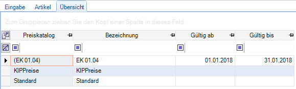 In der Übersicht ist eine Ansicht aller erstellten Einkaufspreiskatalogen. Außerdem kann man sich in der Übersicht anzeigen lassen, wann ein EK-Preiskatalog erstellt wurde, seine Gültigkeit und wer ihn erstellt hat.