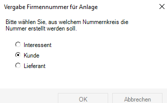 Die Vergabe des Status Aktiv, einer neu angelegten Firma, wird durch den Klick auf OK automatisch vergeben. Die Auswahl eines Status ist entscheidend, da dieser darüber bestimmt aus welchem Nummernkreise die Firmennummer zugewiesen wird.