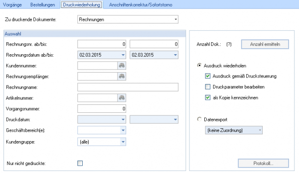 In der Druckwiederholung können Sie alle Dokumente erneut drucken bzw. eine Druckkopie erstellen. Zunächst muss zwischen Ausdruck wiederholen und Datenexport gewählt werden. Je nach Auswahl sind weitere Einstellungen möglich.