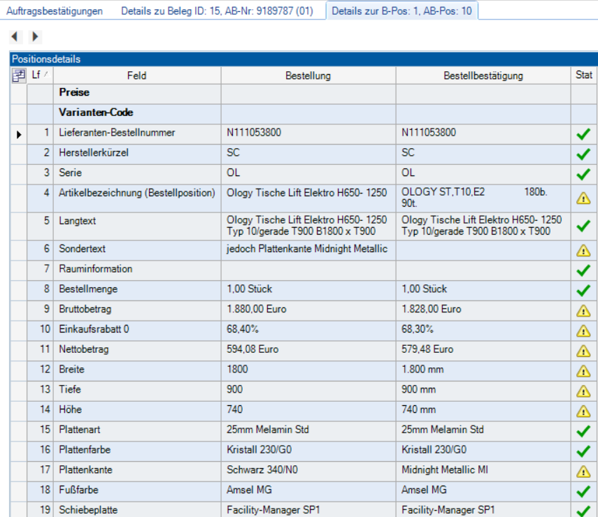 Über einen Doppelklick auf eine Position öffnet sich ein weiterer Reiter, der Bestelldaten und eAB-Daten tabellarisch nebeneinander auflistet. Hier lässt sich genau erkennen, wo eine abweichende Übertragung stattgefunden hat. In der Spalte Status werden korrekte bzw. abweichende Übertragungen entsprechend gekennzeichnet. Mit den Pfeilen im oberen linken Bereich kann man zwischen den einzelnen Positionen „blättern“.