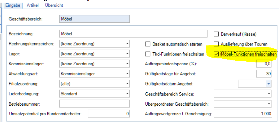 Setzen Sie unter Weitere Stammdaten / Geschäftsbereiche für die betreffenden Geschäftsbereiche der Büroeinrichtung die Funktion „Möbelfunktionen freischalten“.