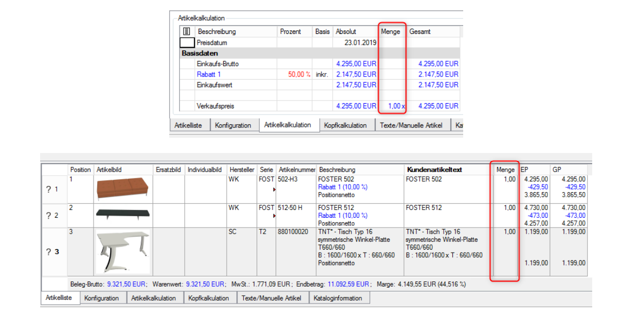 Die Menge können Sie im pCon.basket ändern. Diese kann in der Artikelliste oder zum jeweiligen Artikel in der Artikelkalkulation geändert werden.