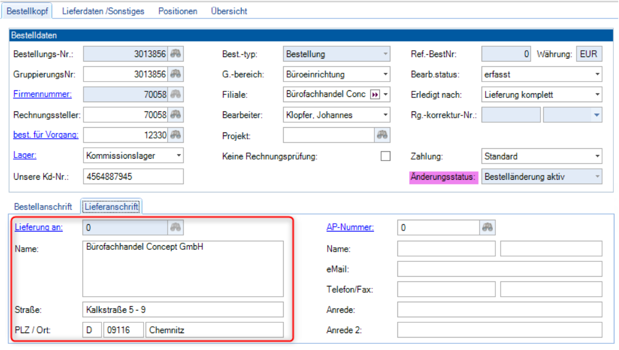 Die Lieferanschrift kann manuell im Bestellkopf abgeändert werden.