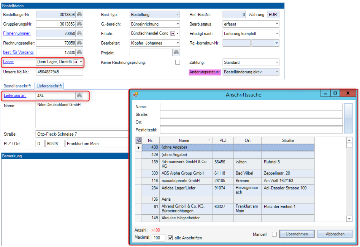 Lieferanschrift ändern durch Lageränderung: Die Lieferanschrift kann durch eine Lageränderung auf das „kein Lager, Direktlieferung„ zusätzlich geändert werden. Hier hat man nun die Möglichkeit aus der Anschriften-Datenbank eine bereits angelegte Anschrift auszuwählen.