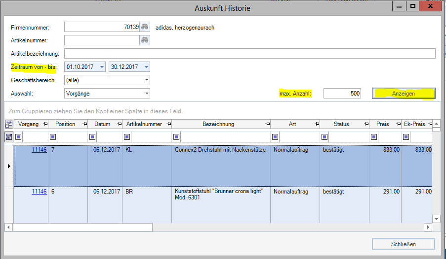 In dem nun erscheinenden Fenster „Auskunft Historie“ haben Sie die Möglichkeit, weitere Suchkriterien zu hinterlegen. Sobald Sie auf „Anzeigen“ klicken, wird die hinterlegte max. Anzahl an Positionen angezeigt: