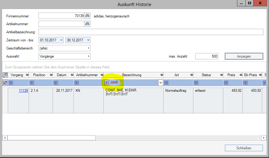 Um die Ergebnisse bereits im Vorfeld einzuschränken, sollten Sie hier bereits die Firmennummer hinterlegen (das Feld „Artikelnummer“ ist für OFML-Artikel nicht relevant). Klicken Sie anschließend auf „Historie anzeigen“:
