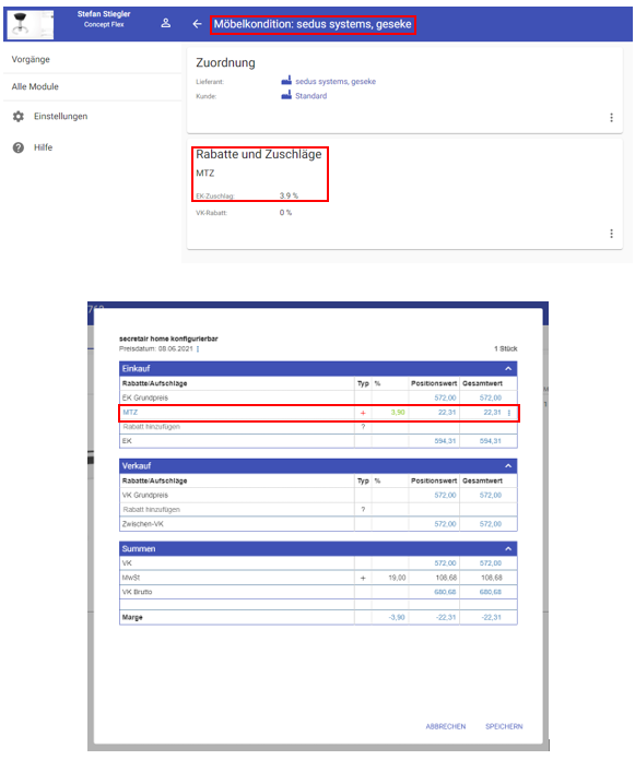 Öffnen Sie das Modul „Möbelkonditionen“. Dort legen Sie bei Sedus eine neue Kondition mit dem gewünschten Materialteuerungszuschlag an (z.B. 3,9%).
