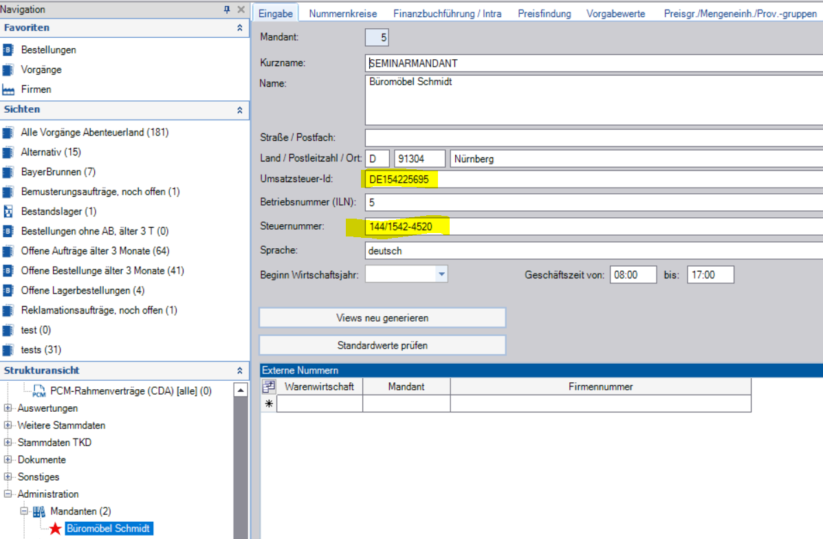 In der Firma des Kunden findet sich unter „Weiteres“ das Feld für die Umsatzsteuer-ID. Diese sollte grundsätzlich vor Anlage von Vorgängen für diesen Kunden befüllt sein. Wird z.B. ein Vorgang ins EU-Ausland mit Mehrwertsteuer berechnet, ist in den meisten Fällen das Fehlen dieser Umsatzsteuer-ID der Hintergrund. In anderen, selteneren Fällen das falsch gesetzte Steuergebiet an der Lieferadresse des Kunden.