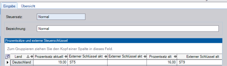 Wichtig ist auch bei angeschlossener Finanzbuchhaltung, unbedingt den sog. „externe Schlüssel“ gemäß Angaben der FiBu zu pflegen, da über ihn dort der hinterlegte Steuersatz geregelt wird! Als Besonderheit kann es weiterhin noch geben (siehe Artikel „Termporäre Mehrwertsteuersenkung“), dass zeitweise mit einem aktuellen und alten Satz gearbeitet wird (siehe Screenshot).