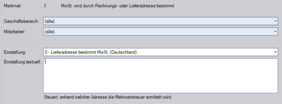 Diese Eintragung gilt dann nur für den aktuellen Vorgang und übersteuert das Steuergebiet, welches an der Lieferadresse des Kunden hinterlegt wurde, manuell!