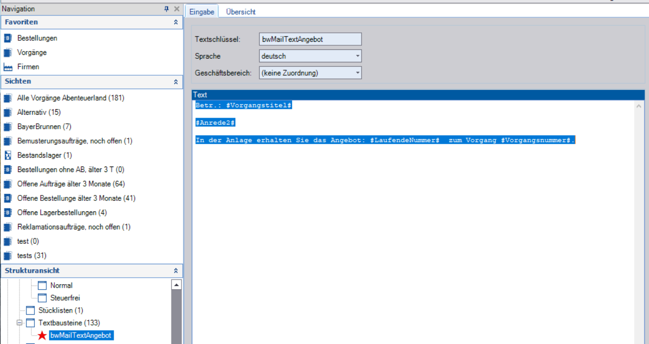 Sie finden alle verfügbaren Textbausteine in „Weitere Stammdaten“ → „Textbausteine“.