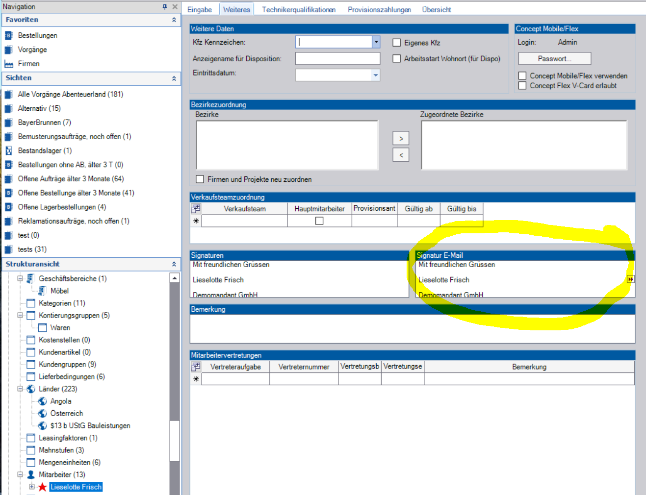 Sofern Ihre Mitarbeiterinnen und Mitarbeiter eigene Mailsignaturen verwenden, müssen diese in „Weitere Stammdaten“ → „Mitarbeiter“ auch noch angepasst werden auf dem gleichen Wege: