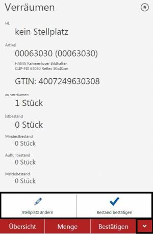 Bestätigung des Artikelbestandes im Modul Verräumen
