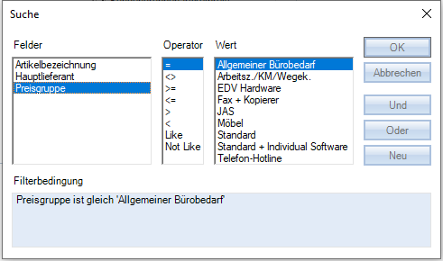 Artikel von-bis | Text-/ Suchfeld | Selektion der Artikelnummer zu der eine Preisliste erstellt werden soll |