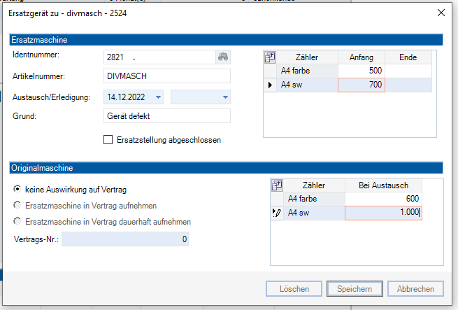 In diesem Abschnitt werden die Zähler der Originalmaschine zum Zeitpunkt des Tausches vermerkt. Damit können noch nicht abgerechnete Zähler im laufenden Abrechnungsintervall bei der nächsten Abrechnung berücksichtig werden.