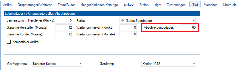 Am Modellartikel (Modul Artikel) sollte zuerst die Abschreibungsdauer in Monaten hinterlegt werden (Registerkarte TKD).