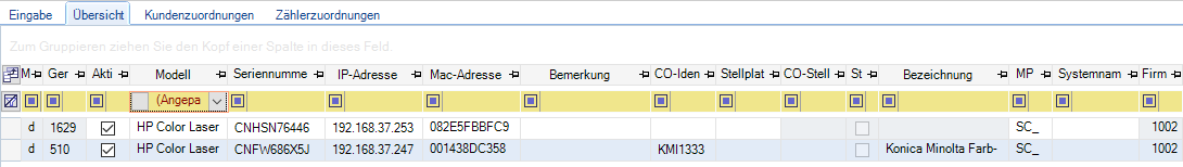 Bei Import versucht Concept Office die MPS-Maschinen mit im Modul Maschinen vorhandenen Geräten abzugleichen und zuzuordnen. Dies geschieht über die Seriennummer oder die MAC-Adresse. Nach dem Import kann auf der Registerkarte Übersicht geprüft werden, ob alle importierten MPS-Geräte zugeordnet wurden. Man erkennt nicht zugeordnete Maschinen an der fehlenden Nummer in der Spalte CO-Identnummer.