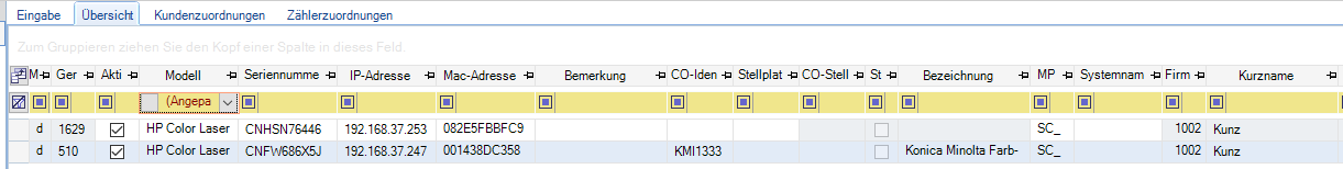 Bei Import versucht Concept Office die MPS-Maschinen mit im Modul Maschinen vorhandenen Geräten abzugleichen und zuzuordnen. Dies geschieht über die Seriennummer oder die MAC-Adresse. Nach dem Import kann auf der Registerkarte Übersicht geprüft werden, ob alle importierten MPS-Geräte zugeordnet wurden. Man erkennt nicht zugeordnete Maschinen an der fehlenden Nummer in der Spalte CO-Maschinennummer.