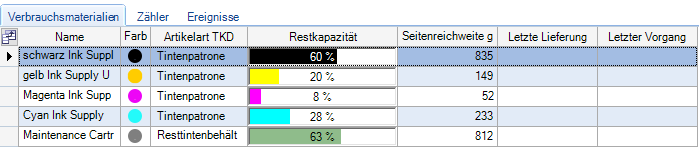 Die am Gerät eingebauten Verbrauchsmaterialien werden mit Füllstand, Reichweite und dem Datum der letzten Lieferung angezeigt.