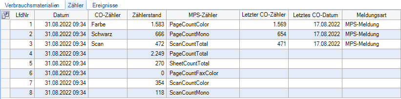 In der Zählerübersicht werden die Zähler des MPS-Systems sowie deren Zuordnung zu Concept Office-Zählern angezeigt. Die Zuordnung der Zähler kann auf der gleichnamigen Registerkarte editiert werden.