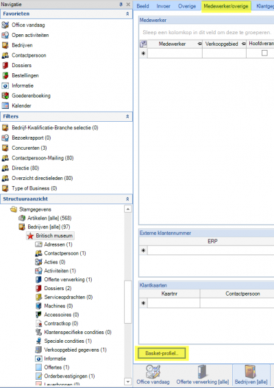 Omdat het profiel ook na het sluiten van de offerte nog op te roepen is, kan het direct aan de klant gekoppeld worden. Hiervoor moet de klant in Concept Office geopend worden, en moet de knop „Basket-profiel“ onder „Medewerker/overige“ aangeklikt worden. Het profiel is hier nu te selecteren. Na het toewijzen van het profiel staat deze voor alle bestaande en nieuwe dossiers ter beschikking. Als deze regel weer wordt verwijderd is het profiel niet meer actief.