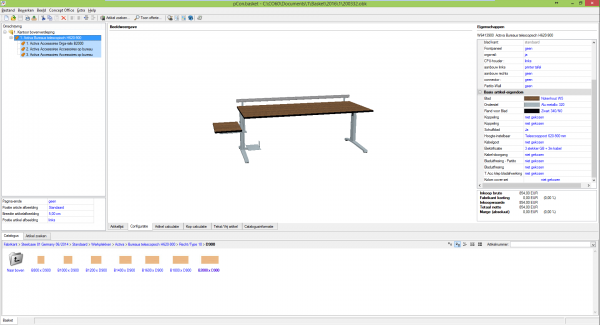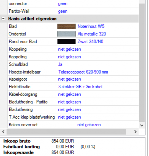 Dit kan het beste aan de hand van een voorbeeld getoond worden: In de toekomst moet bij een klant, een „notenhouten“ blad als standaard ingesteld worden. Het onderstel moet „Alu metallic“ zijn, de tafelranden „zwart“. De klant koopt deze tafel altijd met een elektrificatie.