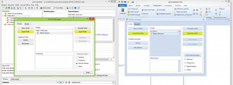 Ja, dat is mogelijk. Zowel in de profiel manager als in pCon.basket als ook in pCon.planner is er een import en export functie beschikbaar. Daarmee wordt een bestand gegenereerd die weer in het andere programma ingelezen kan worden.