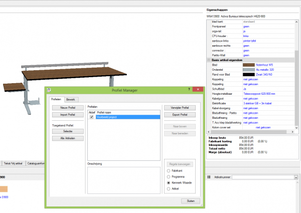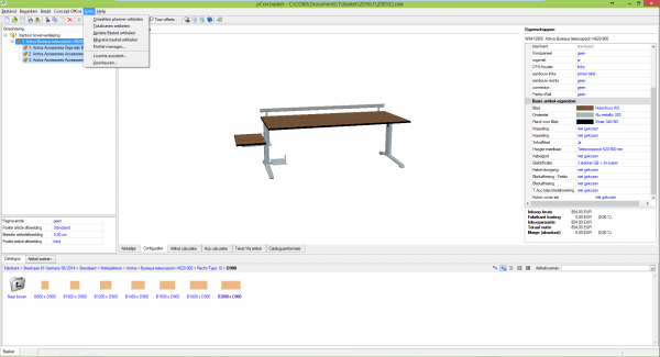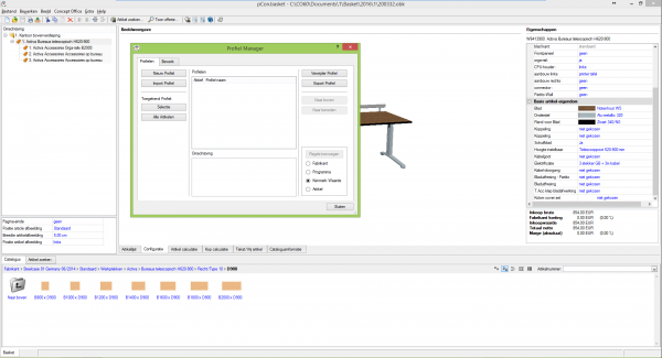 Het profiel wordt in beginsel in pCon.basket of in pCon.planner aangemaakt. Deze beschrijving toont het aanmaken van een profiel in pCon.basket, waarbij er geen wezenlijk verschil met pCon.planner is. Voor het aanmaken van een profiel heeft men in Concept Office een dossier met „gebruikelijke“ producten nodig. Vooral bij tafels of kasten is het niet noodzakelijk dat elke maat opgenomen wordt. Dit werkt alleen binnen de mogelijkheden van het betreffende product. Als bijvoorbeeld „notenhout“ voor een bureaublad wordt gekozen in het formaat 2000x900mm, dan wordt deze keuze ook voor andere formaten en vormen overgenomen. De beste uitgangspositie is een nieuw of bestaand dossier met gebruikelijke artikelen. Dit dossier dient slechts als voorstel en heeft geen invloed op het profiel.