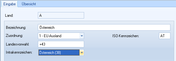 Om een land aan te maken, gaat u naar Uitgebreide stamgegevens/Landen en klikt u op de knop [Nieuw] in het menu. U dient bij het nieuw aan te maken land een kort, eenduidig kenmerk toe te kennen, bijvoorbeeld het ISO-3166 kenmerk of het KFZ-kenmerk. Deze naam mag maximaal 10 tekens lang zijn.
